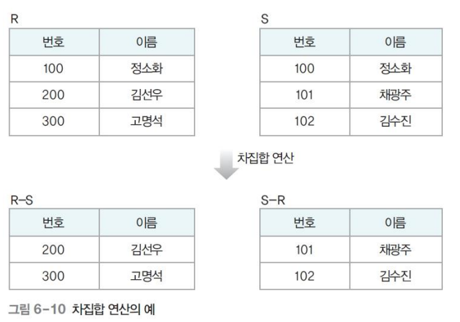 - 릴레이션 R에는 존재하지만 릴레이션 S에는 존재하지 않는 투플로 결과 릴레이션 구성