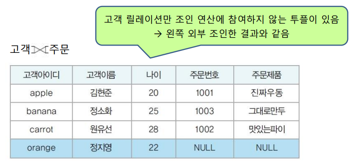 자연 조인 연산에서 제외되는 투플도 결과 릴레이션에 포함시키는 조인