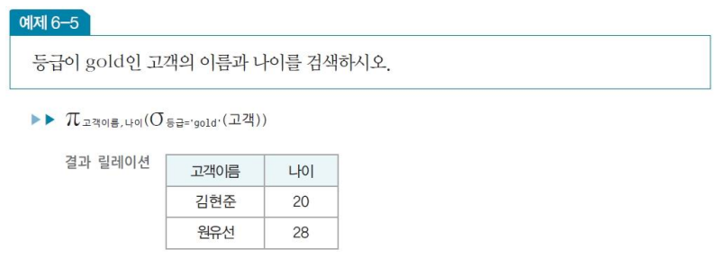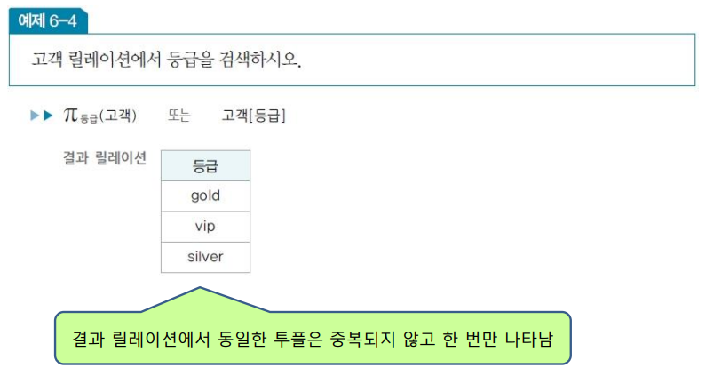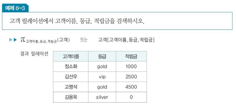 릴레이션에서 선택한 속성의 값으로 결과 릴레이션을 구성