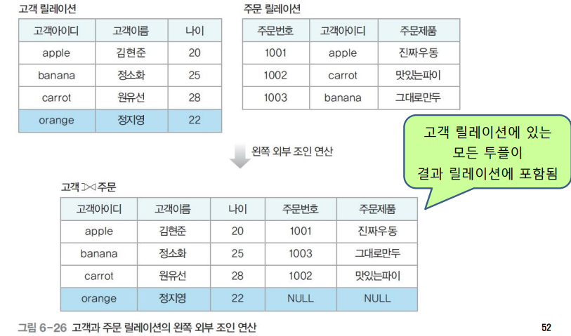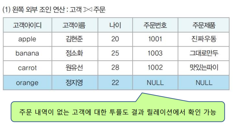 왼쪽에 있는 릴레이션1에 존재하는 모든 투플을 결과 릴레이션에 포함시킴