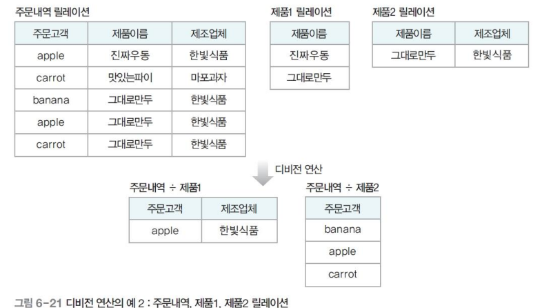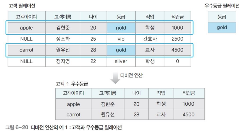 • 단, 릴레이션1이 릴레이션2의 모든 속성을 포함하고 있어야 연산이 가능함 (도메인이 같아야 함)