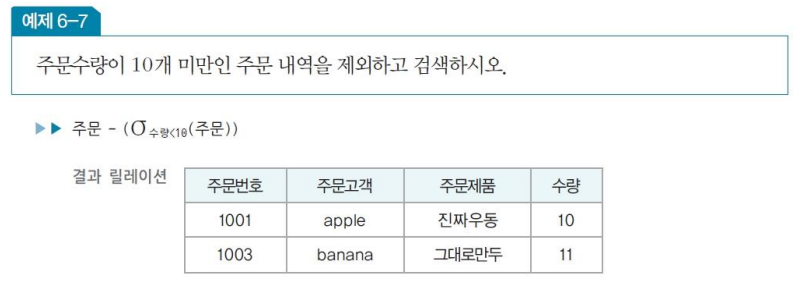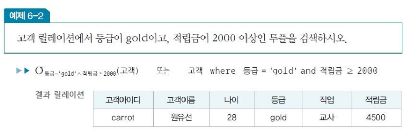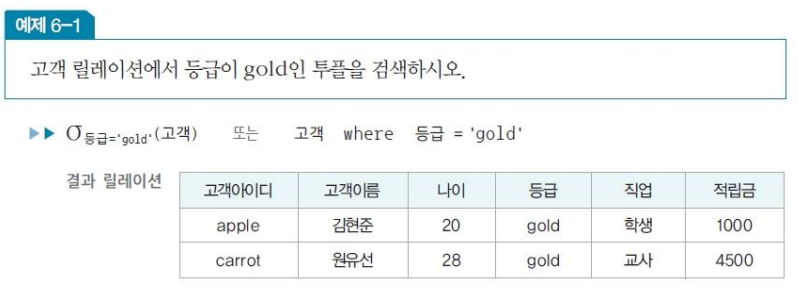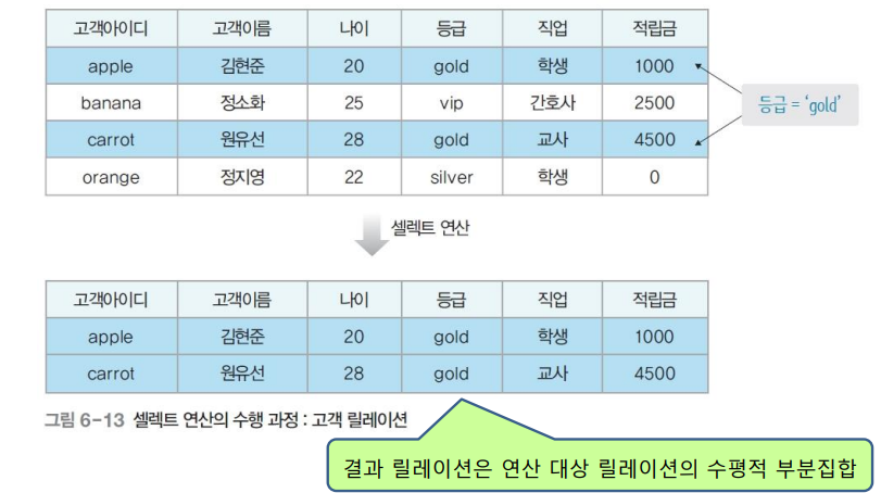 릴레이션에서 조건을 만족하는 투플만 선택하여 결과 릴레이션을 구성