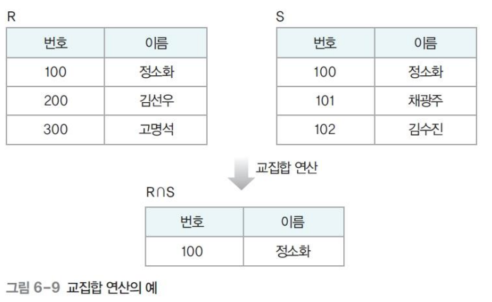 - 릴레이션 R과 S에 공통으로 속하는 투플로 결과 릴레이션 구성