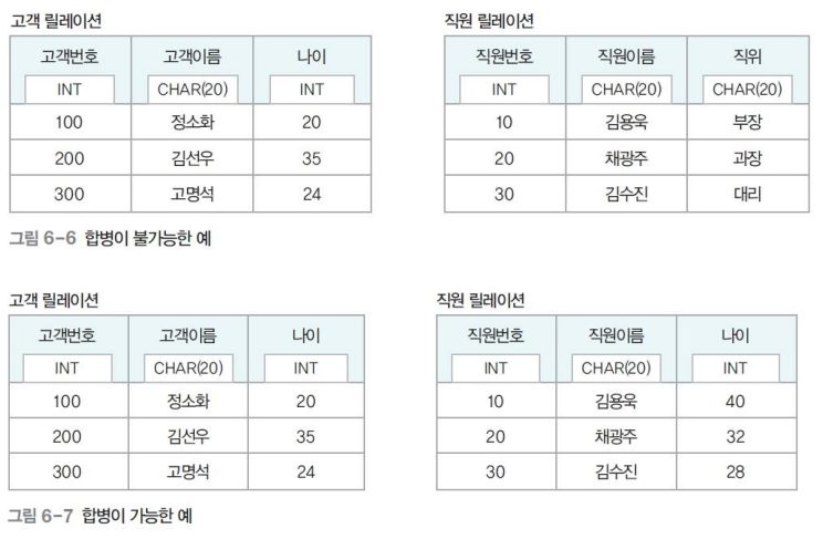 합집합, 교집합, 차집합은 피연산자인 두 릴레이션이 합병가능해야함.