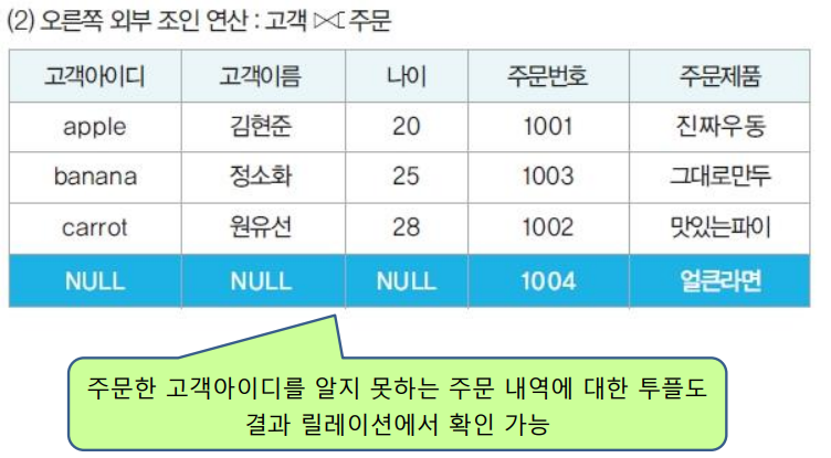 오른쪽에 있는 릴레이션2에 존재하는 모든 투플을 결과 릴레이션에 포함시킴