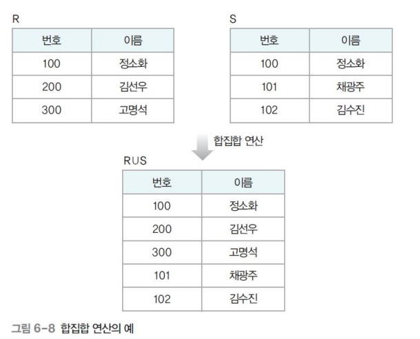 - 릴레이션 R에 속하거나 릴레이션 S에 속하는 모든 투플로 결과 릴레이션 구성