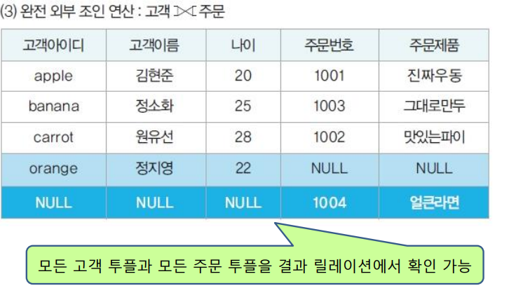 결과 릴레이션에서 속성 값이 없는 경우는 널 값으로 처리
