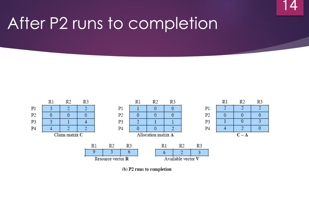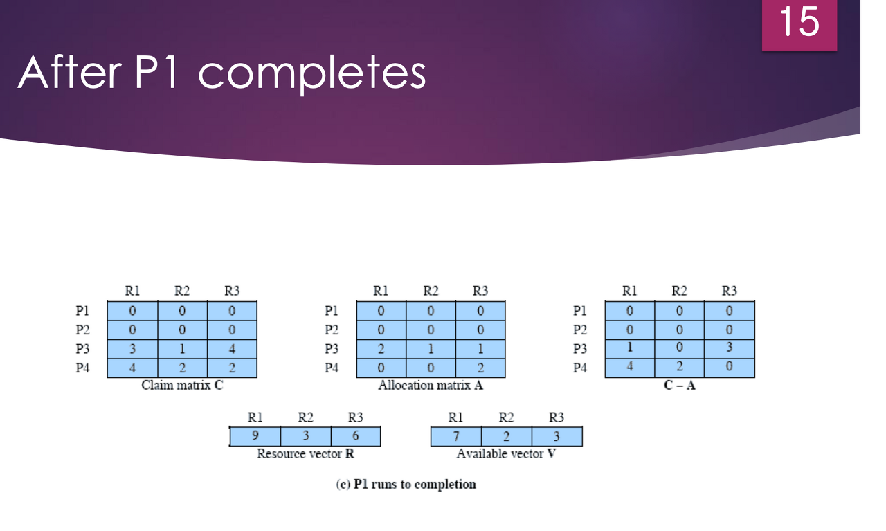 ⇒ P2가 먼저 종료 했다고 가정 → P2에 할당 됐던 자원을 모두 반환.