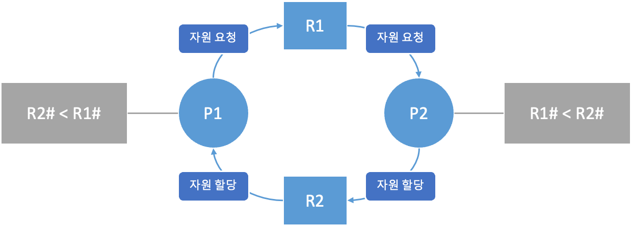 즉, 내가 필요한 자원의 순서대로가 아니라, 번호 순서대로 요청해야 하기 때문에 필요 없는 자원도 요청하게 될 수 있어 자원 낭비의 가능성이 존재하게 된다.