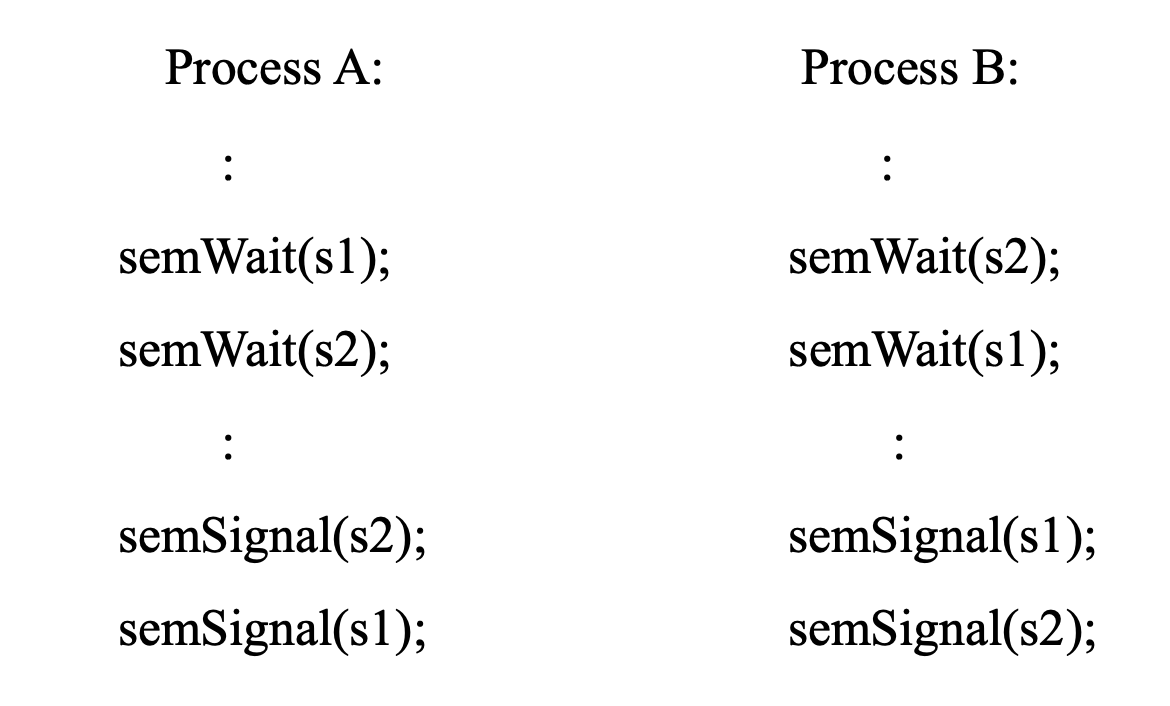 이 block 상태를 해결하려면 서로의 프로세스가 semSignal()을 해주어야 하는데 semSignal() 를 줄 프로세스가 같이 block됐기 때문에 block 상태에서 아무도 빠져나올 수 없다.