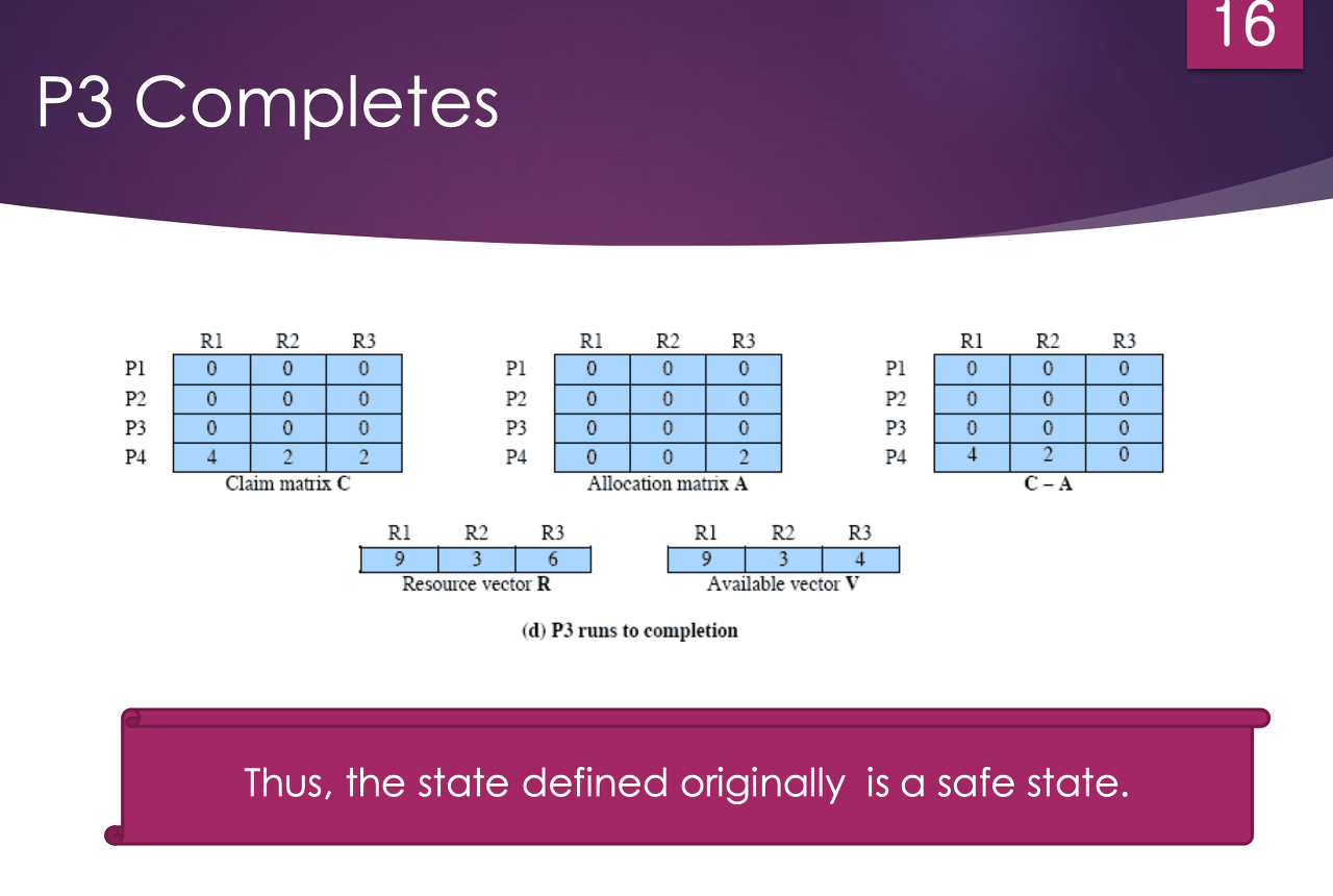 종료할 수 있다의 의미: 지금 현재 남아있는 자원인 Available vector에 있는 자원을 전부 주면 종료할 수 있다는 의미이다.