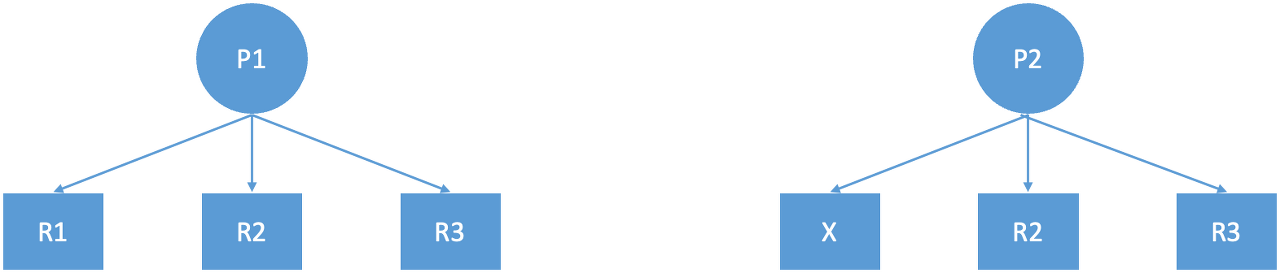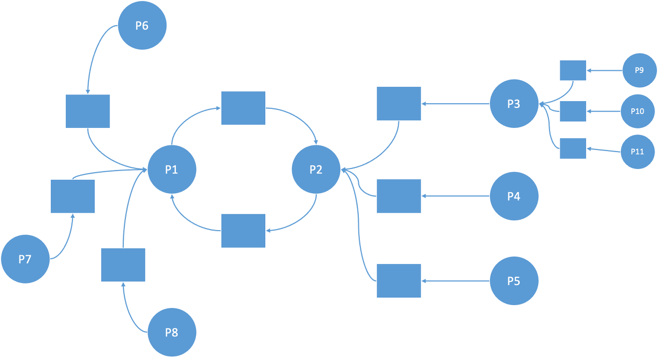 P1과 P2가 원래 가지고 있던 자원이 존재하고, 이 자원들을 필요로 하는 프로세스들이 존재한다. 이와 같이 P1과 P2에 엮인 나머지 Process들이 존재한다.