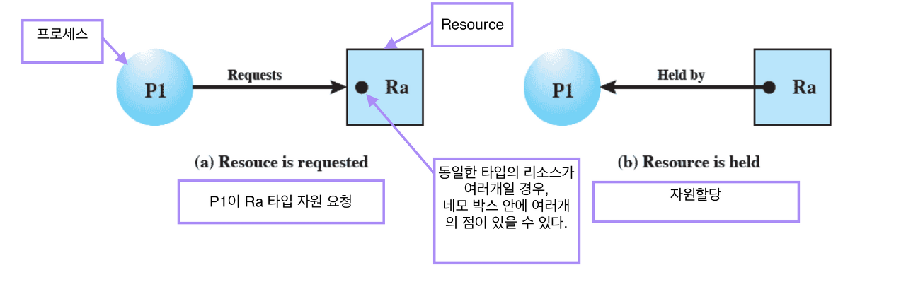 OS는 프로세스가 시스템 안에서 자원을 요청하고 할당받는 사이에 이와 같은 Cricular Wait가 발생하는지 알아보기 위해 Resource Allocation Graph를 그릴 수 있다.