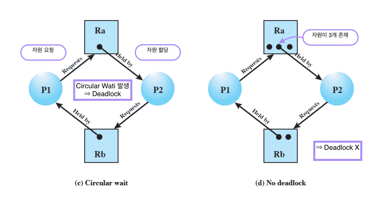 - Deadlock 이 발생하기 위해서는 최소한 둘 이상의 프로세스가 필요하다.