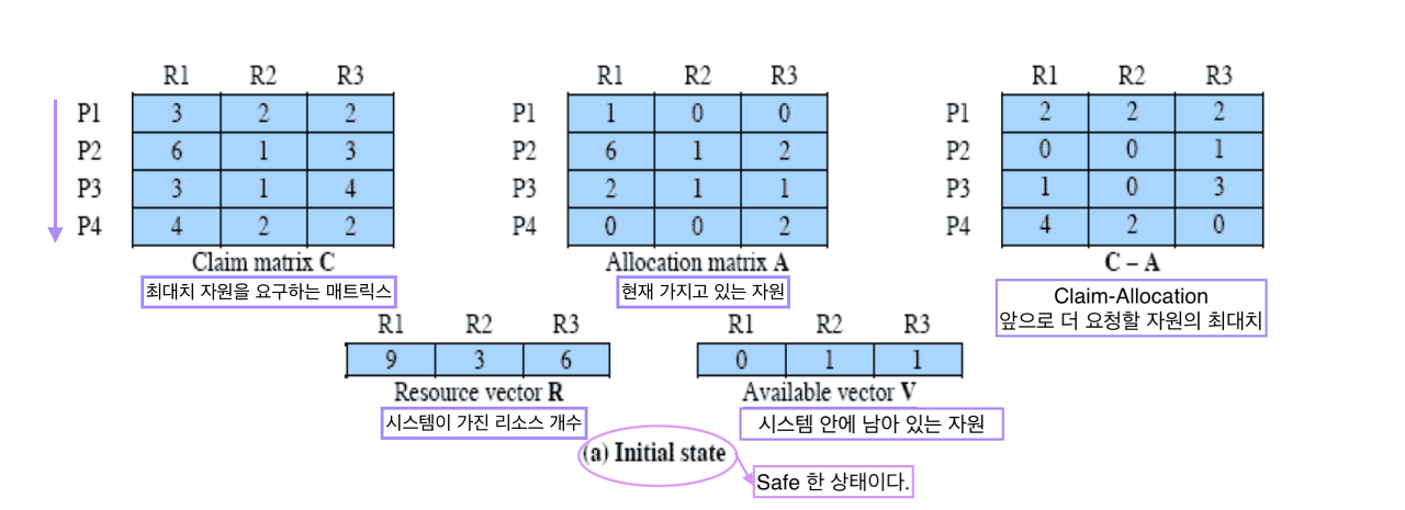 ↳ 프로세스가 자신이 필요한 자원 최대를 OS에게 미리 보고 → OS가 검사 → 내가(OS) 가진 Resource를 Process들이 전부 사용해도 부족한지, 안부족한지 검사한다.