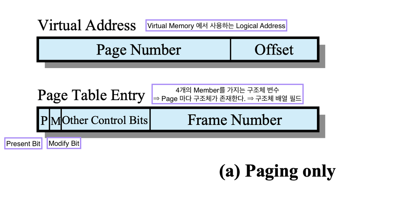 한 페이지마다 해당하는 페이지의 Presence bit, Modify bit, Other Control Bit, Frame# 가 구성요소로 존재한다.