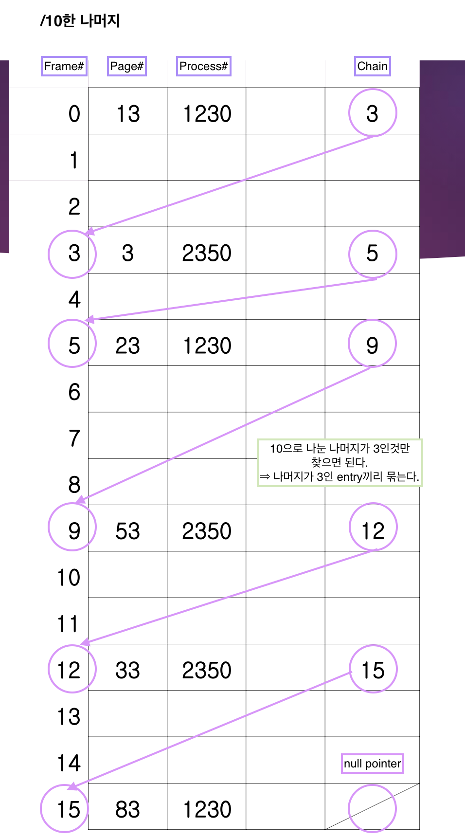 ⇒ 나머지가 3인 링크의 시작점이 몇번 Frame 에 있는지 알려준다.
