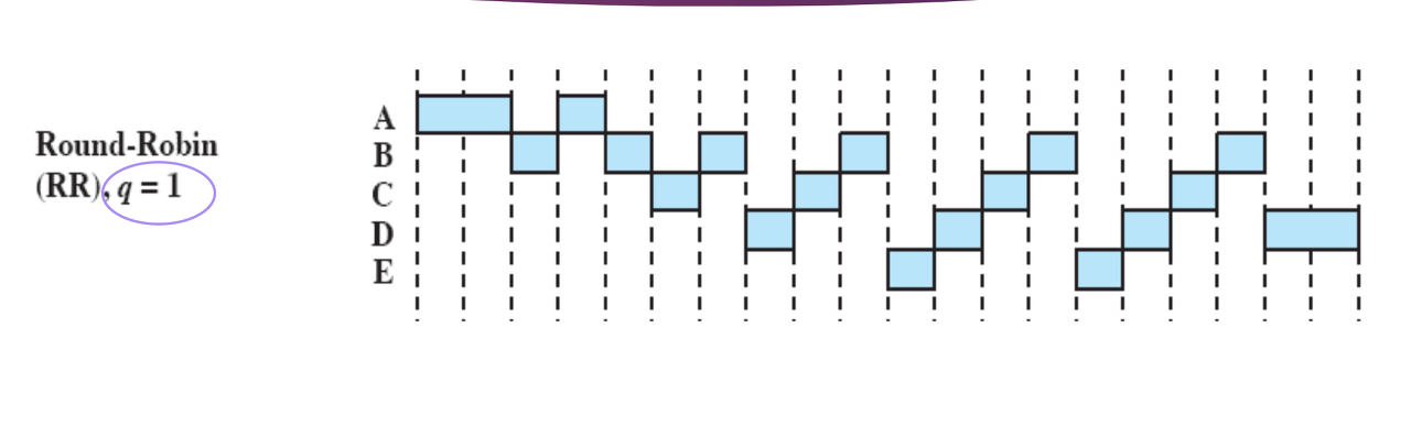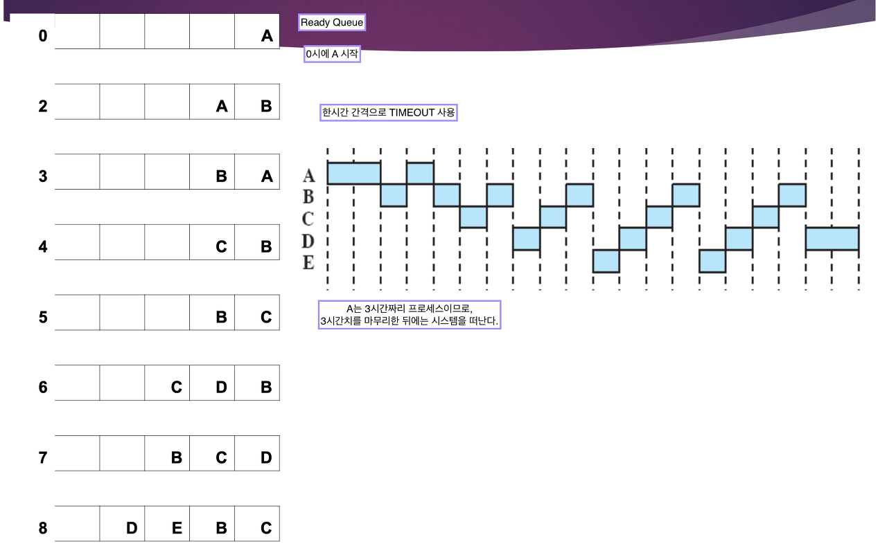 Queue 에 들어 있는 프로세스 입장에서 봤을 때, A → B → C → D → E → A → B → C → D → E 순으로 실행되어서 이름이 Round-Robin 방식이다.