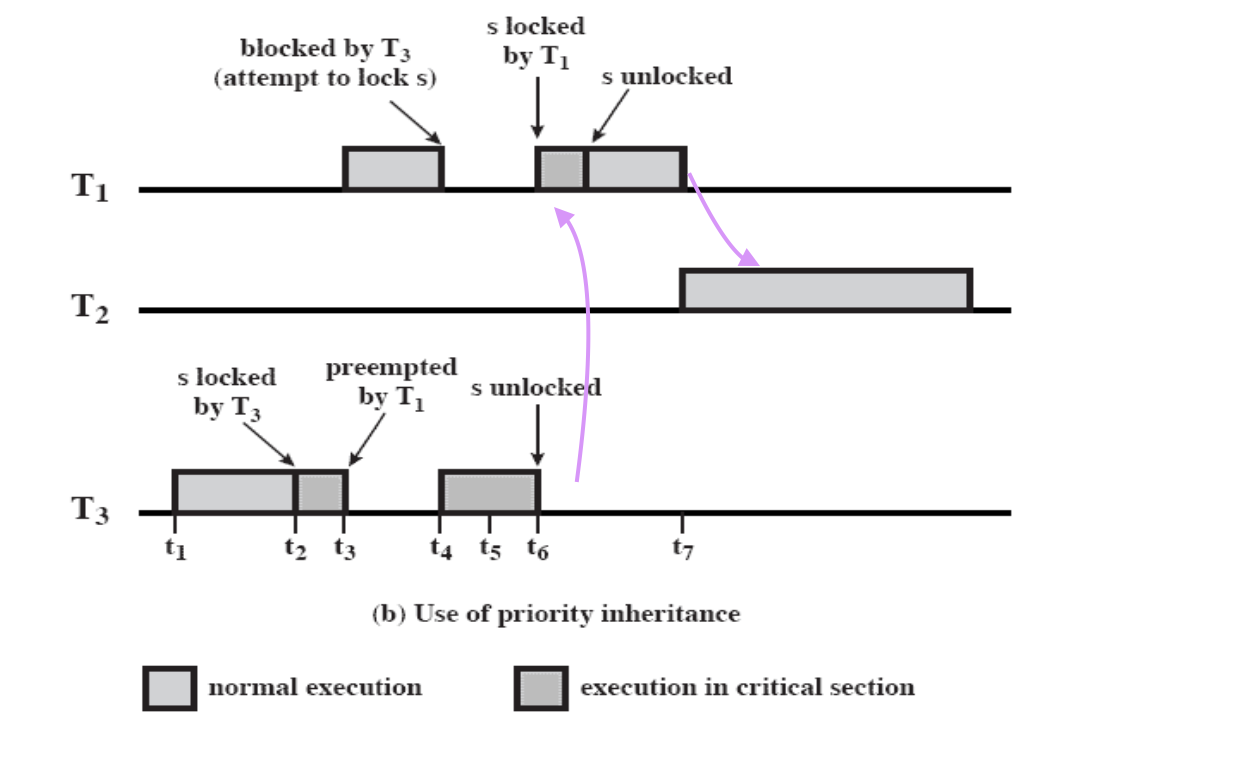 T3 가 작업하다 T1 에게 CPU 를 걸고 T1 이 s 에 lock 을 걸려고 할 때, T3 의 우선순위를 T1 만큼 높여준다.