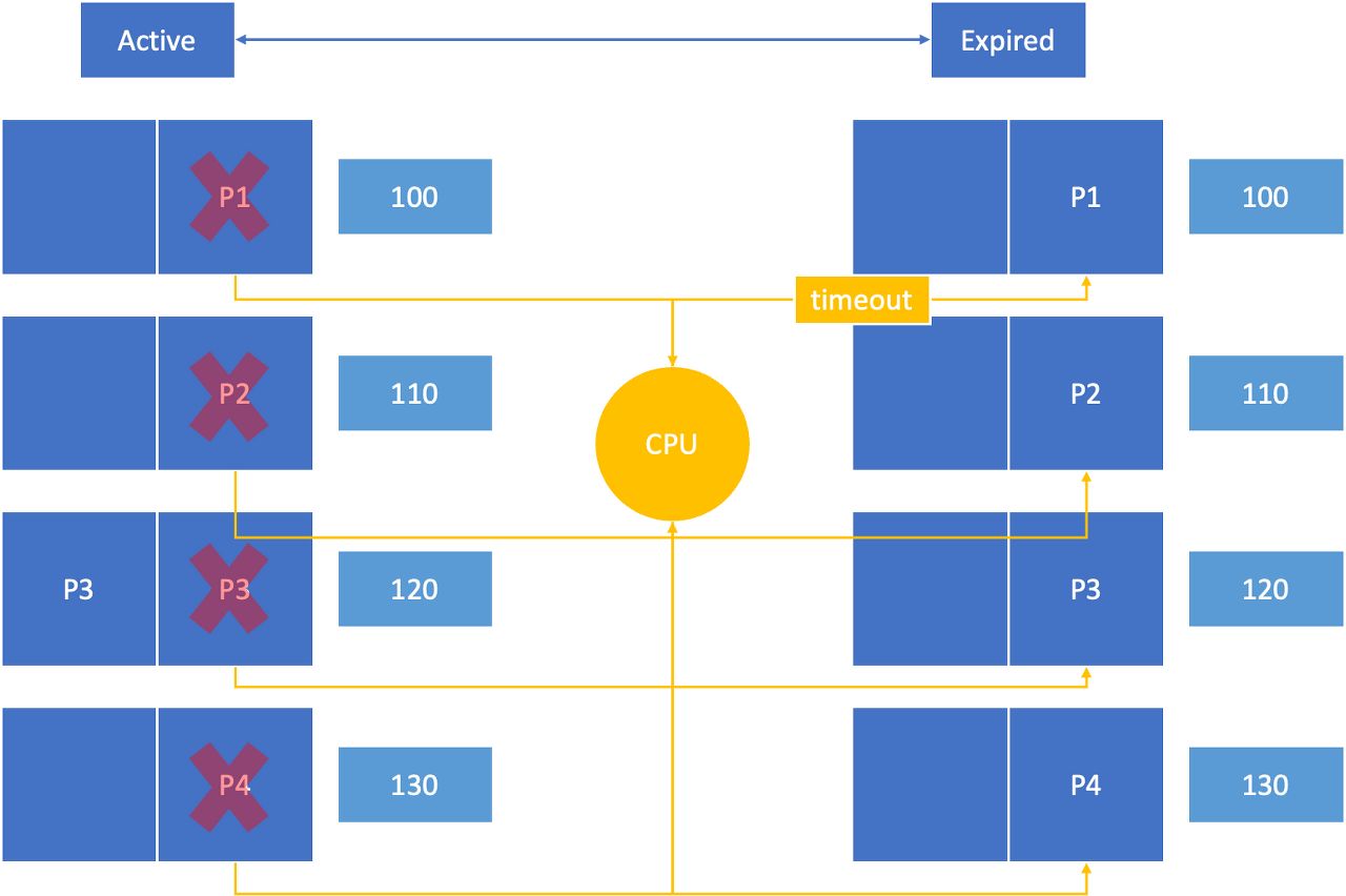 → 이 경우 다시 active queue 로 돌아간다. - 어느 순간 active queue 가 모두 비게 되는데, Queue 를 Active 와 Expired 를 서로 바꾸어 준다.