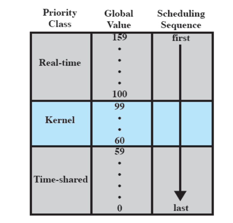 ( real time class 에 있는 프로세스 중에 우선순위가 같은 것들이 있다. 이 경우, Round-Robin 으로 작업하게 된다.)- fixed priority and a fixed time quantum