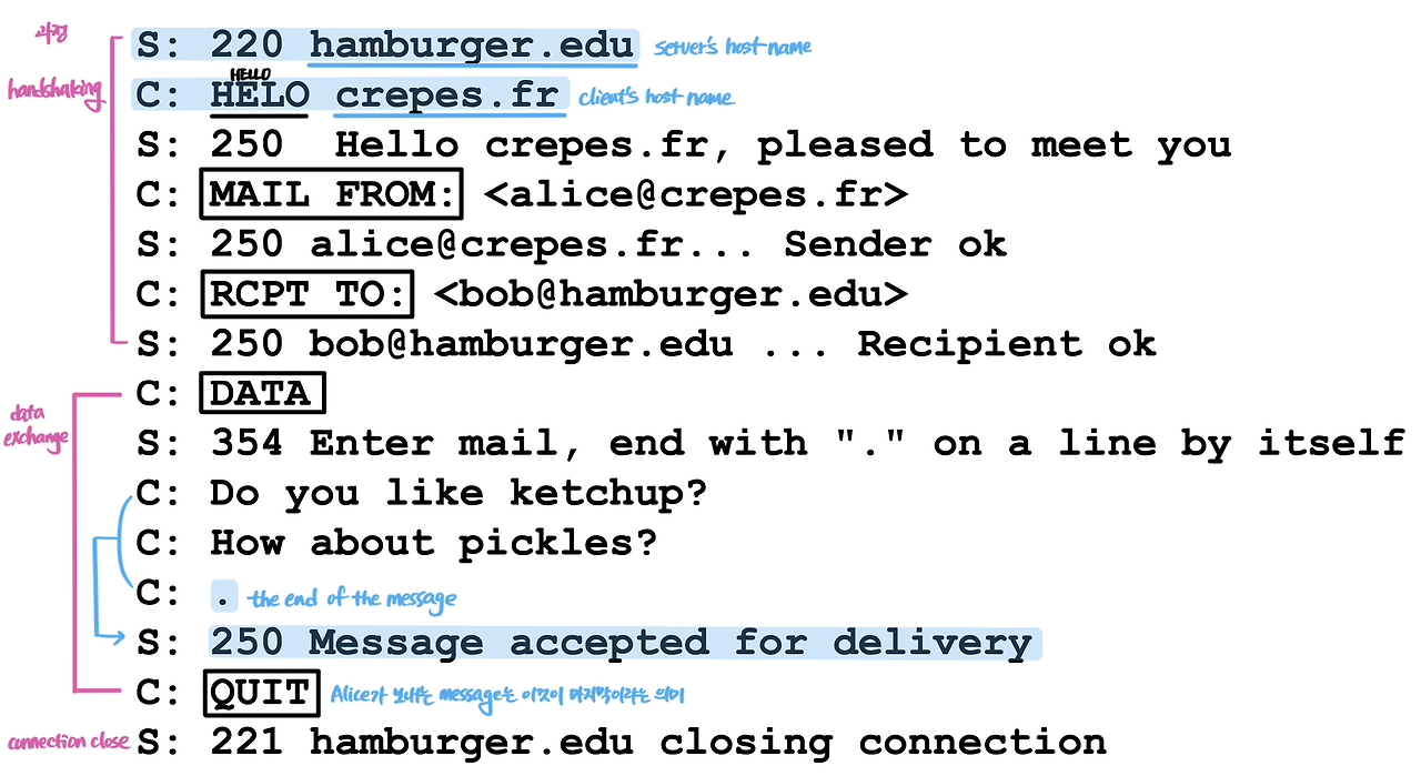 - 클라이언트는 5개의 HELO, MAIL FROM, RCPT TO, DATA, QUIT 명령을 내린다.