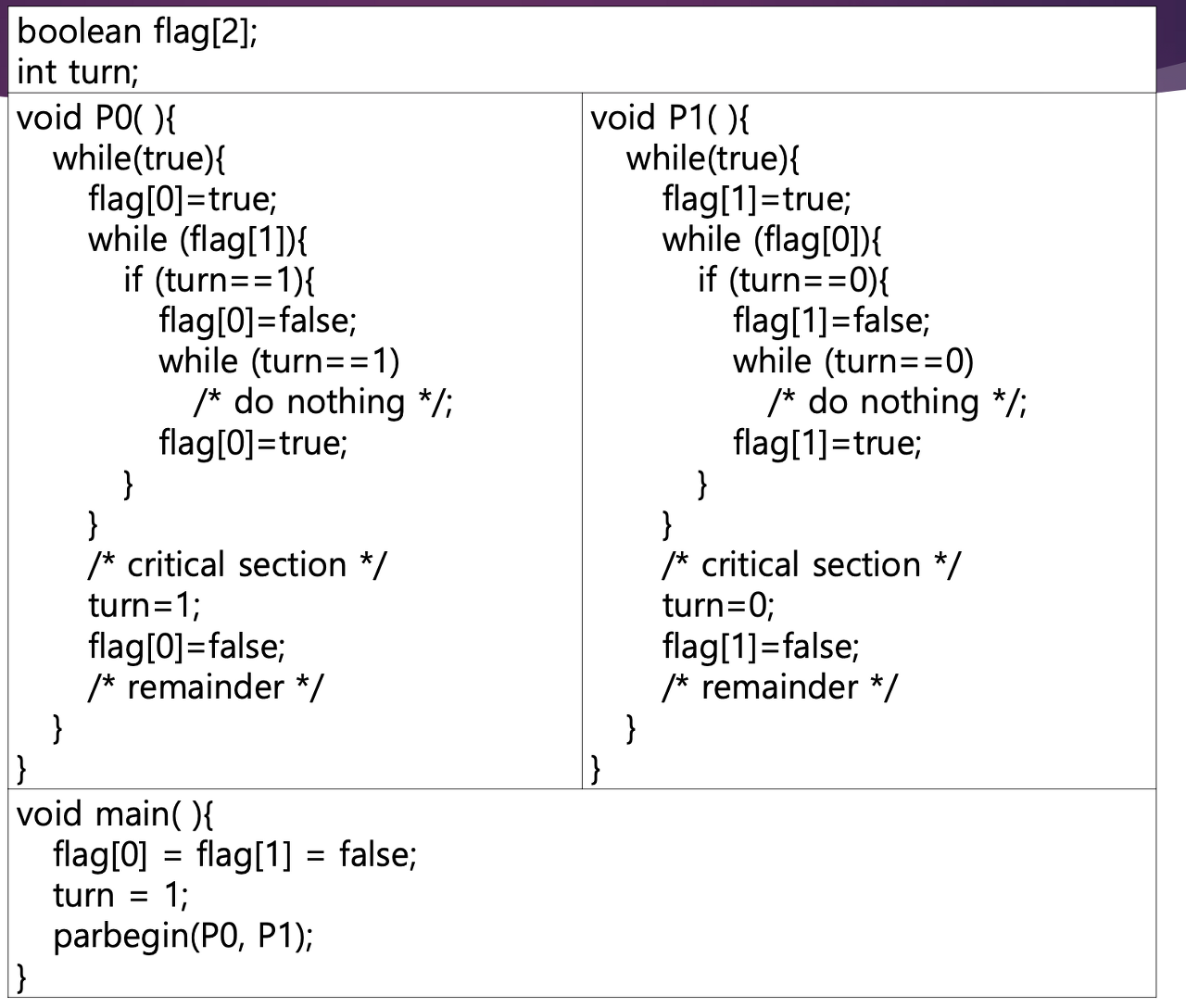 Q1. P0가 Critical Section에 진입했을 때, P0가 Critical Section 실행 후, P1이 대기하고 있다가 P0가 다시 진입이 가능한가? → 가능하다. P1가 flag가 false인한, 가능하다.