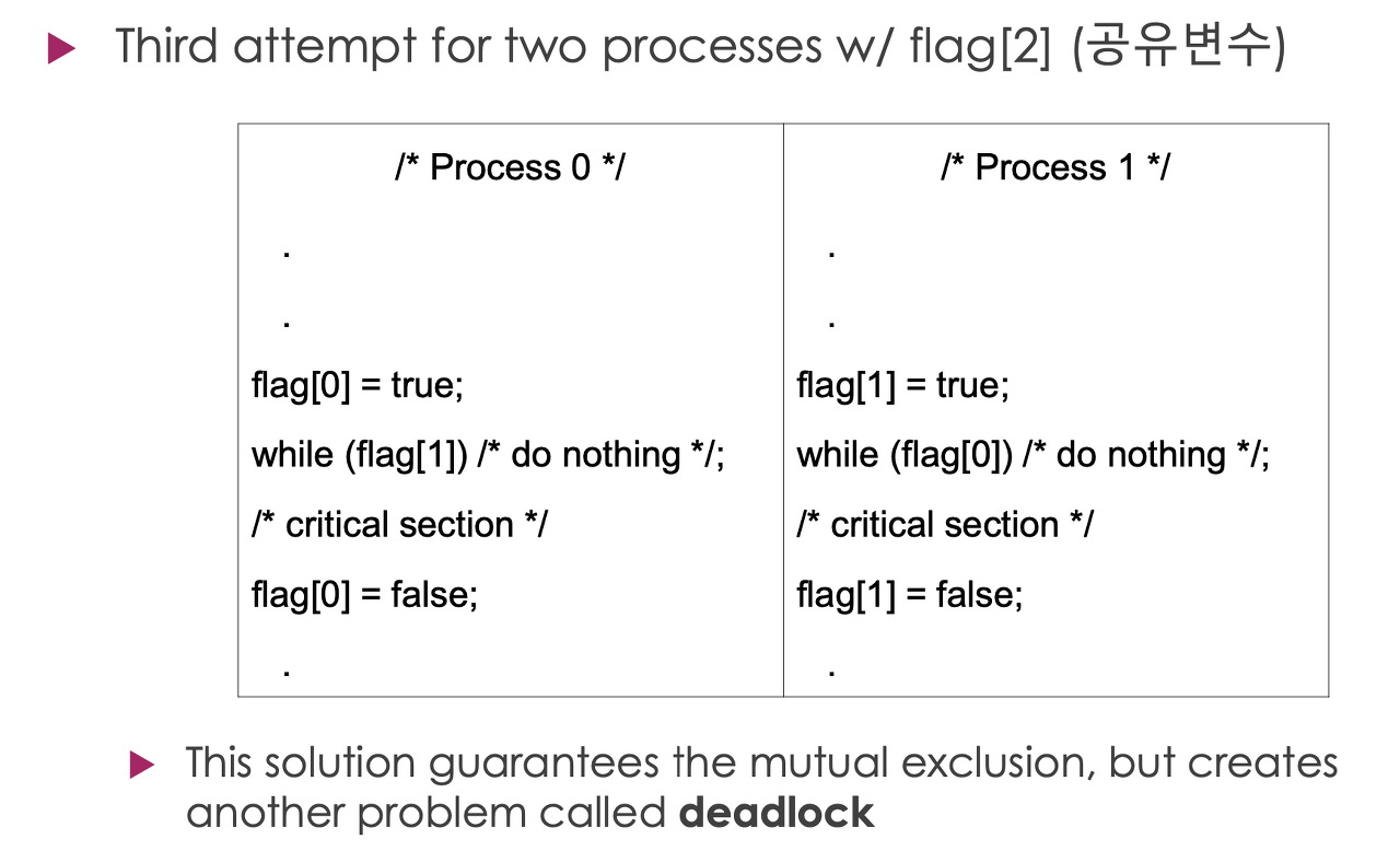 결정적인 문제는, 우리들이 가정한 것은 시스템 안에 Process가 2개만 존재한다고 했는데, 시스템 안에 프로세스가 늘어나게 되면 지금까지의 알고리즘들을 적용하기가 어려워 진다. 훨씬 복잡한 알고리즘을 사용해야 한다.