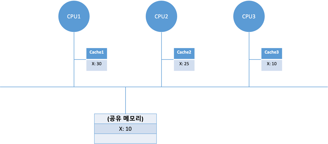 즉, CPU1이 x값을 10에서 30으로 바꾸는 순간, 모든 캐시값과 메모리에 있는 모든 x가 30으로 바뀌어야 한다.
