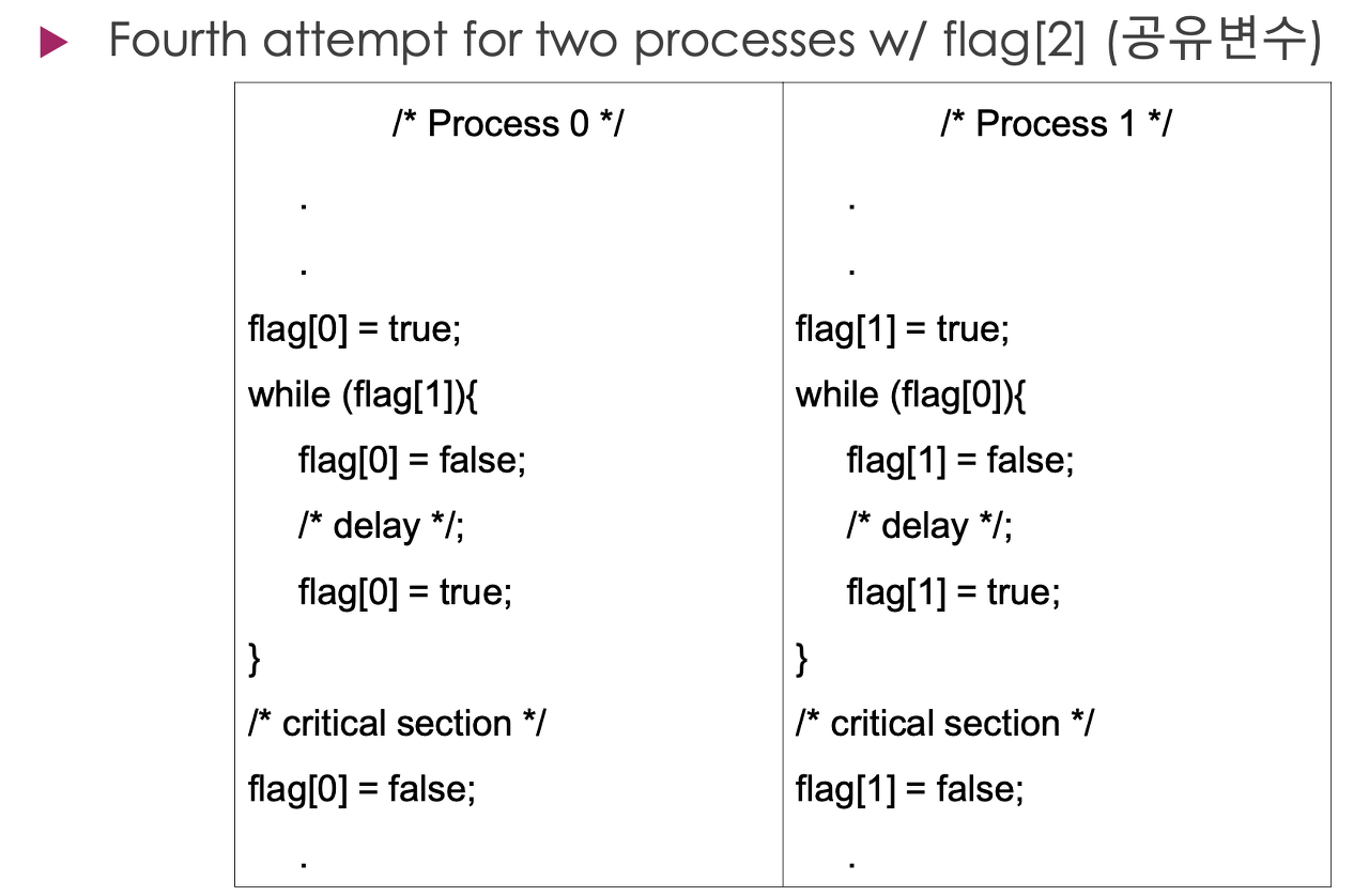상대편 flag가 false인 동안에는 내가 계속 Critical Section을 실행해도 Starvation이라고 하지 않는다.