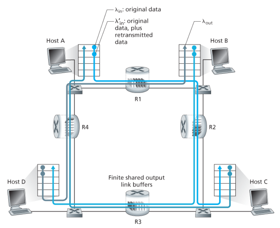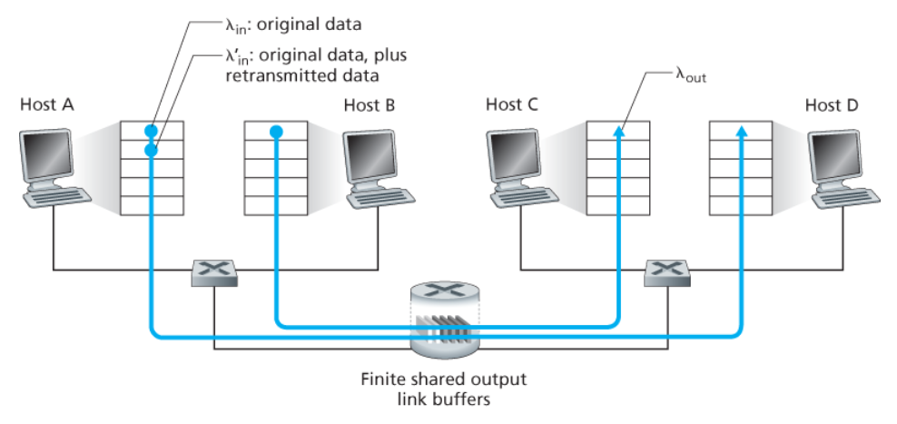 - 호스트 A와 B의 애플리케이션이 λin 바이트/초의 평균 전송률로 데이터를 전송하고 있다.