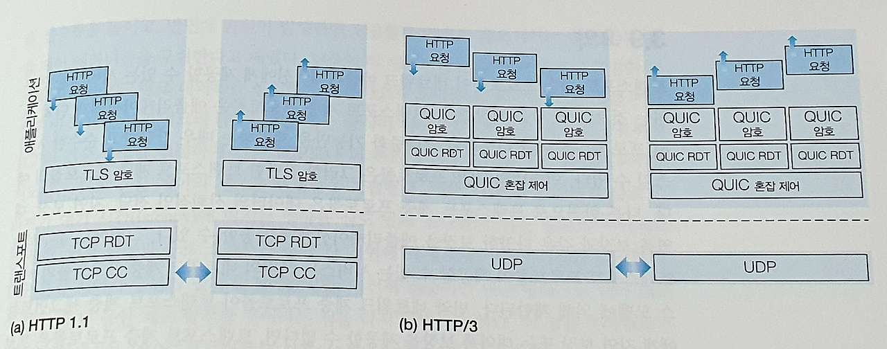 처음부터 새롭게 설계된 애플리케이션 계층 프로토콜이다. - 오늘날 인터넷의 7% 이상이 QUIC이다.