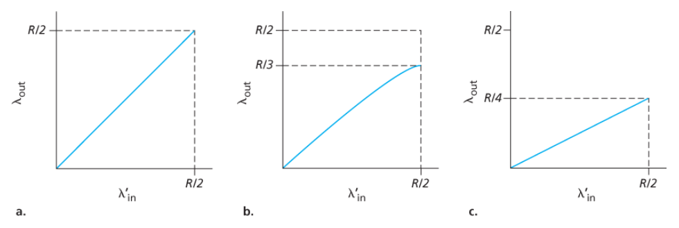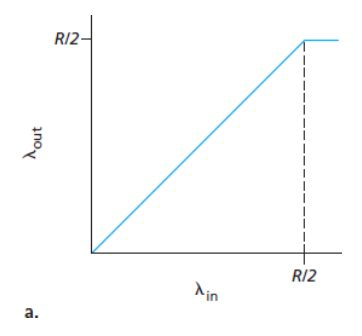 - 각 패킷이 라우터에 의해 두 번씩 전달된다고 가정했을 때, 제공된 부하가 R/2일 때의 처리량은 R/4