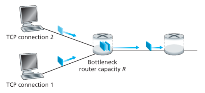 각각 다른 종단 간의 경로를 갖지만, 모두 R bps의 전송률인 병목 링크(bottleneck link)를 지나는 K개의 TCP 연결을 생각해보자.