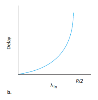 - 전송률이 R/2에 근접할 경우 : 평균 지연은 점점 커진다.