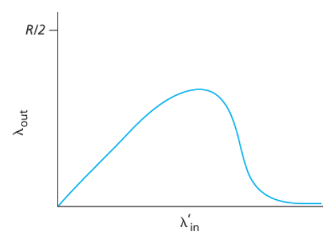 - 라우터 R2는 λin과 관계없이, R1에서 R2까지의 링크 용량, 최대 R인 도착률을 가질 수 있다.
