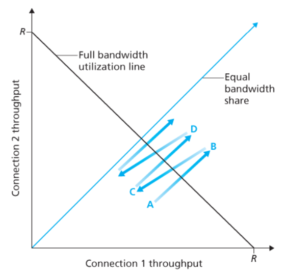 각 연결의 평균 전송률이 R/K에 가깝다면 혼잡 제어는 메커니즘이 공평하다고 한다.