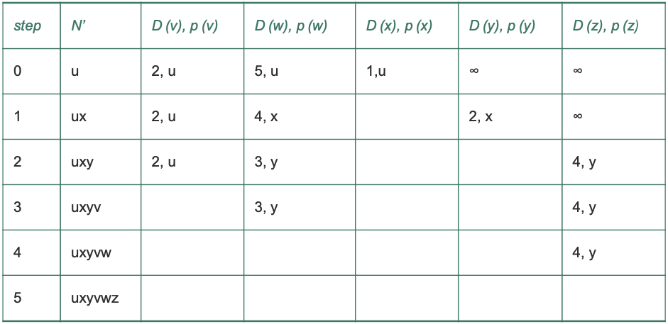 아래 그래프의 네트워크에서 링크 상태 알고리즘을 수행한 결과는 다음과 같다.