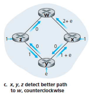 링크 상태 알고리즘이 다시 수행되면 노드 y는 w로 가는 시계 방향의 경로 비용이 1인 반면,