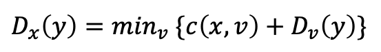 - x에서 v로 이동한 후, v에서 y까지의 최소 비용 경로를 택한다면, 경로 비용은 c(x, v) + d.v(y)일 것이다.