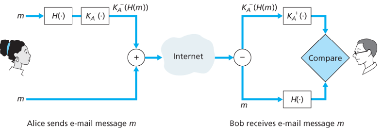 - 메세지 m에 해시 알고리즘을 적용한 결과와 4의 결과를 비교하여 같으면 보낸 사람을 확인할 수 있고, 메시지의 무결성을 확인할 수 있다.