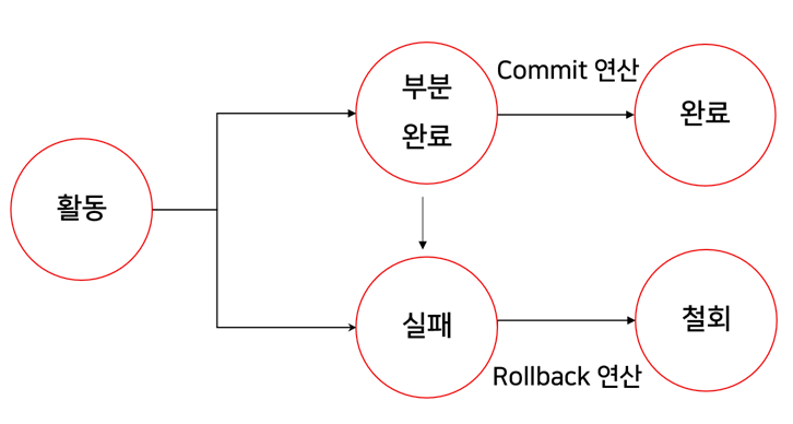 - 트랜잭션은 다섯 가지 상태 중 하나에 속하게 됨