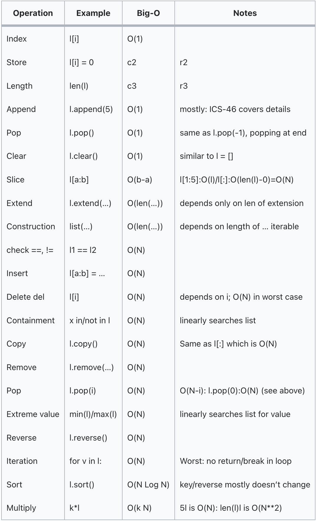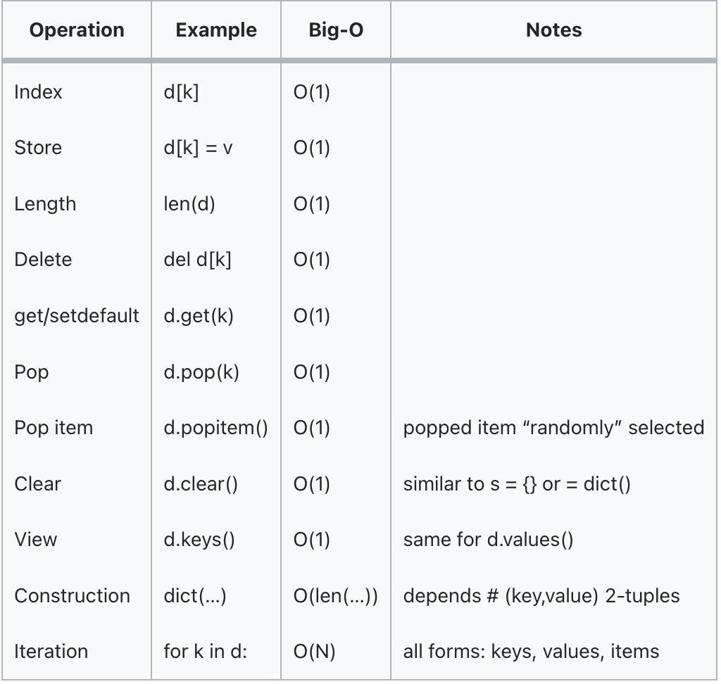 삽입(insert,pop), 제거(delete, remove) , 탐색(check ==,≠) 포함여부 확인( containment(in, not in))의 경우 List는 전부 O(N)이다. Set,Dict은 O(1)혹은 O(len)의 시간을 가지고 있다.