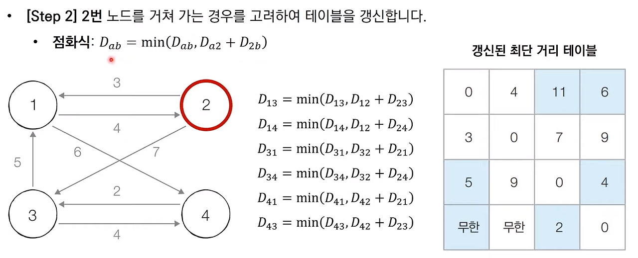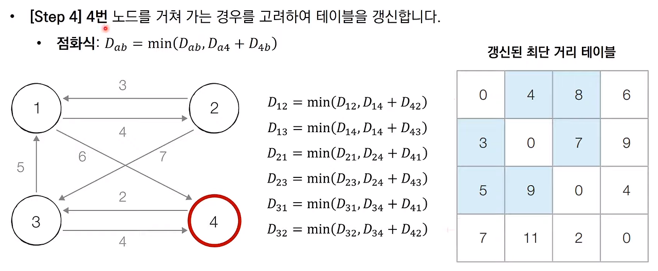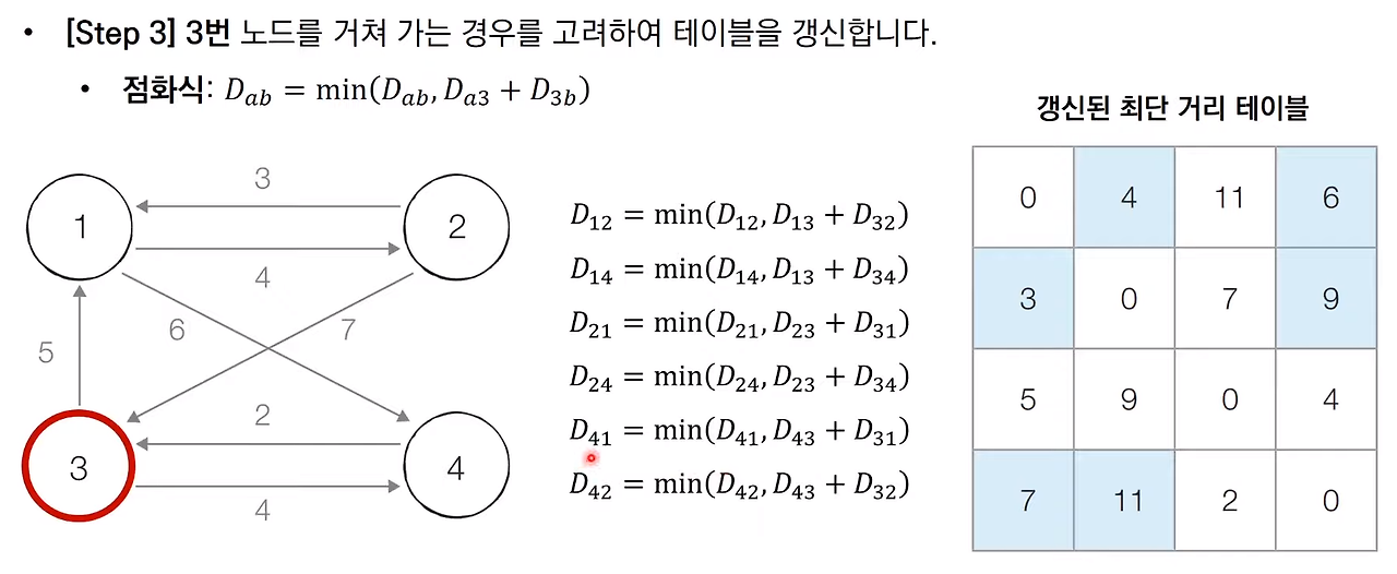 - 각 단계마다 특정한 노드 k를 거쳐 가는 경우를 확인한다.