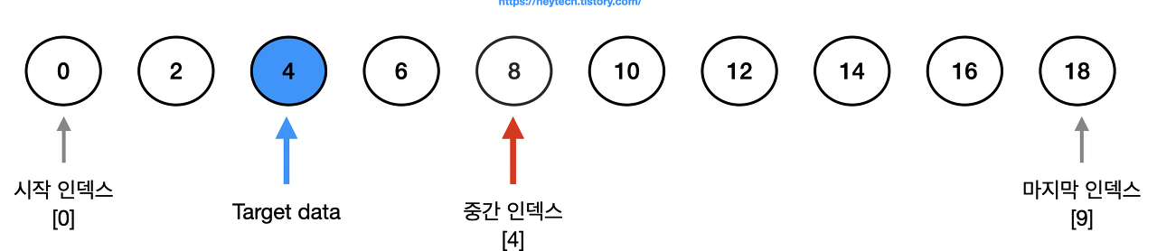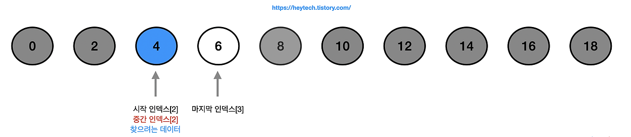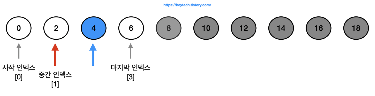 1️⃣ 시작 인덱스와 마지막 인덱스 사이의 중간 값에서 소수점 이하를 버려 중간 인덱스를 정합니다.