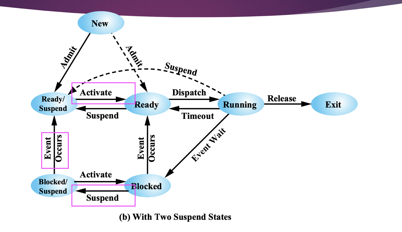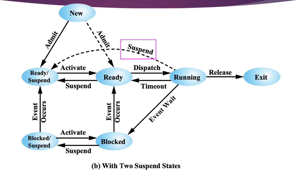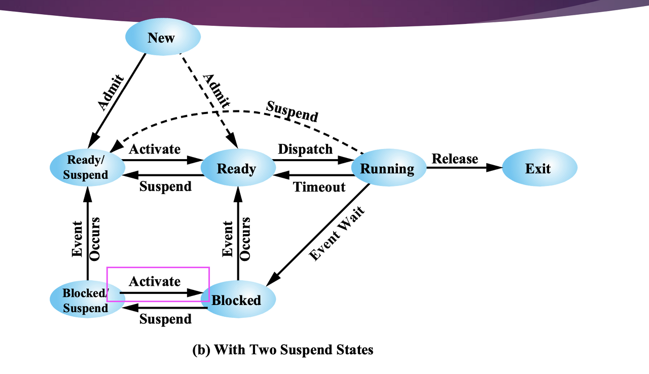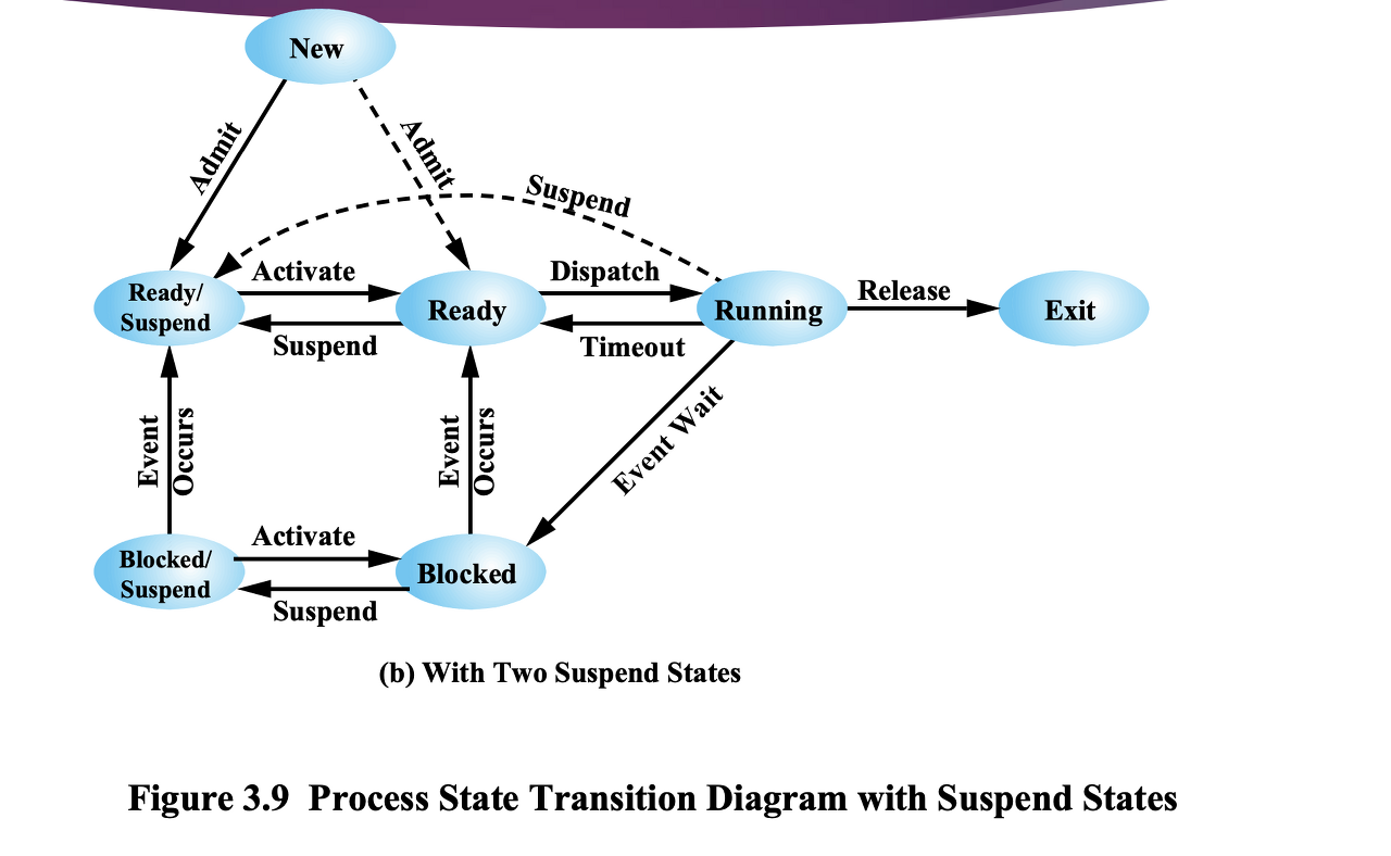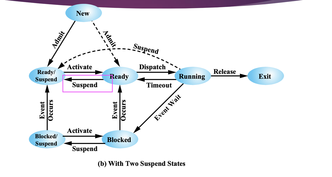Swapping 에 의한 Suspension 에 따라서 Process 상태는 다음과 같이 변한다.Blocked → Blocked Suspend → Ready /Suspend → Ready