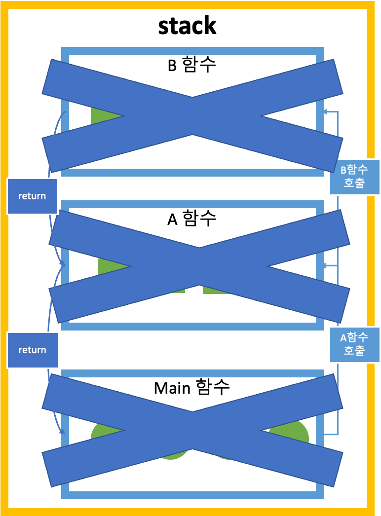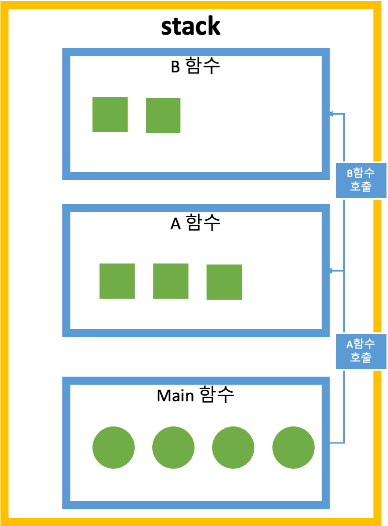 stack 에서는 함수가 호출될 때마다 그 함수에서 사용할 변수들을 저장할 공간이 쌓였다가,