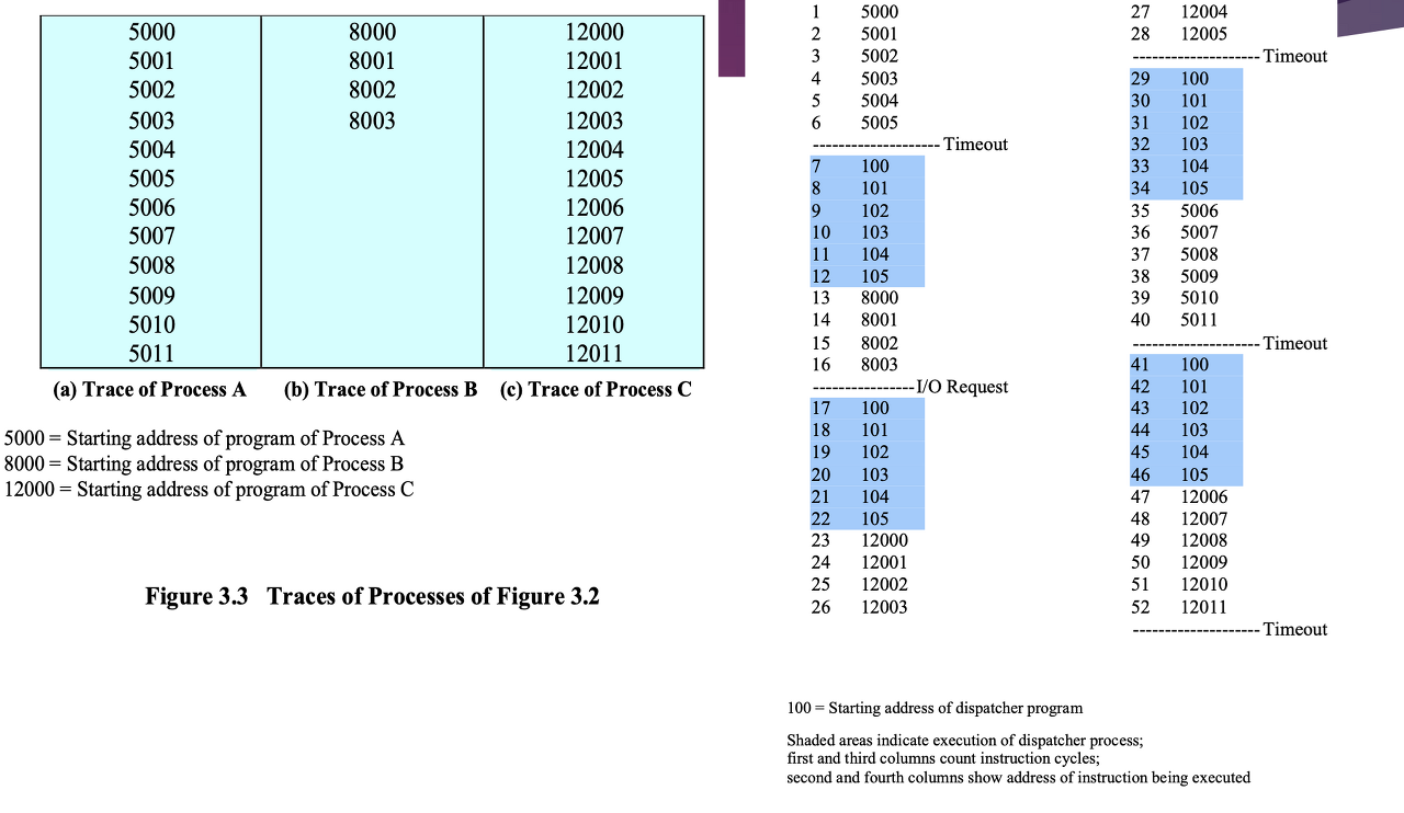 identifier(id), state, priority, pc, memory pointer, context data, I/O status information, accounting information, ... - 프로그램은 실행하다 멈췄다를 반복할 것이다.